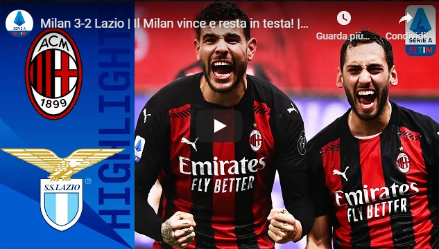 MILAN-LAZIO 3-2 | GOL E HIGHLIGHTS | GIORNATA 14 | SERIE A TIM 2020/21: 23 dicembre 2020 – Il Milan vince contro la Lazio e mantiene il primo posto della classifica. Sblocca Rebic al 10′ di testa da corner. Al 17′ raddoppia Calhanoglu su rigore. Riapre tutto la Lazio con Luis Alberto che ribatte in rete un rigore parato da Donnarumma a Immobile. Nella ripresa pari dello stesso Immobile, ma il gol partita è di Theo Hernandez al 92′. Pioli a +1 sull’Inter. La Lazio resta a quota 21 punti.