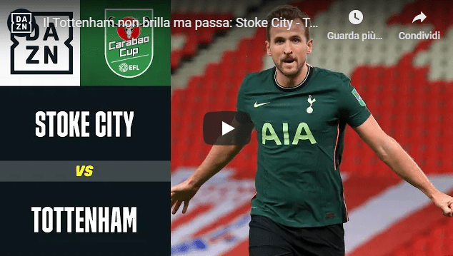 STOKE CITY – TOTTENHAM 1-3 | GOL E HIGHLIGHTS | CARABAO CUP: 23 dicembre 2020 – Il Tottenham di Mourinho trova il vantaggio con Bale, poi si fa riprendere da Thompson. Davies è il solito Kane regalano l’accesso alla semifinale agli Spurs.