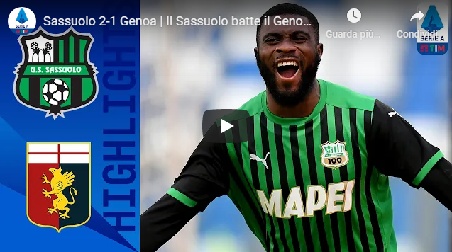SASSUOLO-GENOA 2-1 | GOL E HIGHLIGHTS | GIORNATA 16 | SERIE A TIM 2020/21: 6 gennaio 2021 – Una partita vivace e giocata bene da entrambe le squadre. Il Sassuolo nella ripresa riesce a trovare il vantaggio con Boga, ma viene raggiungo da Shomurodov, nel finale è però Raspadori a riportare in vantaggio e regalare la vittoria agli emiliani.