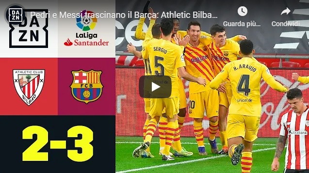 ATHLETIC BILBAO-BARCELLONA 2-3 | GOL E HIGHLIGHTS | GIORNATA 2 | LALIGA 2020/21: 6 gennaio 2021 – Nel recupero della seconda giornata della Liga spagnola, vittoria esterna del Barcellona sull’Athletic Bilbao. La squadra di Ronald Koeman si è assicurata i tre punti respingendo il tentativo di rimonta degli avversari che, dopo la rete del 2-3 arrivata al 90′ con Muniain, non sono riusciti a centrare il pareggio.
