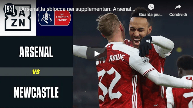 ARSENAL-NEWCASTLE 2-0| GOL E HIGHLIGHTS | FA CUP: 9 gennaio 2021 – L’Arsenal accede al quarto turno di FA Cup non senza dover sudare per avere la meglio sul Newcastle. I gol infatti arrivano solo nei supplementari e portano le firme del giovane Smith Rowe e di Aubameyang.