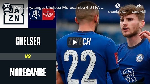 CHELSEA-MORECAMBE 4-0 | GOL E HIGHLIGHTS | FA CUP: 10 gennaio 2021 – Il Chelsea di Frank Lampard passa agevolmente il turno di FA Cup contro il Morecambe. Poker di reti firmato da Mount, Werner, Hudson-Odoi e Havertz.