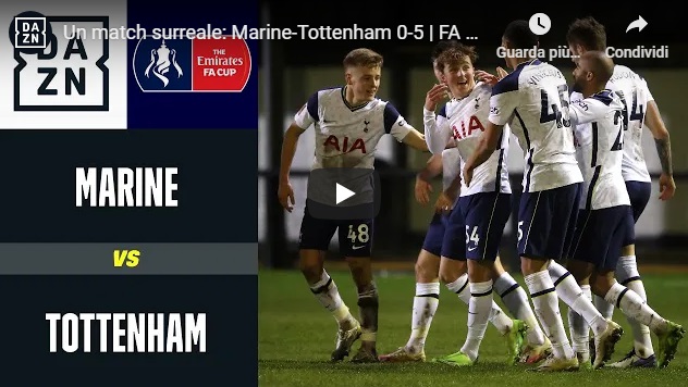 MARINE-TOTTENHAM 0-5 | GOL E HIGHLIGHTS | FA CUP: 10 gennaio 2021 – Tutto facile per gli uomini di Mourinho contro il Marine, club di ottava serie inglese. A segno Vinicius per tre volte, Lucas Moura e Alfie Devine che a 16 anni e 163 giorni diventa il più giovane marcatore di sempre degli Spurs.