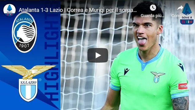 ATALANTA-LAZIO 1-3 | GOL E HIGHLIGHTS | GIORNATA 20 | SERIE A TIM 2020/21: Bergamo 31 gennaio 2021 – La Lazio di Inzaghi si prende la rivincita dopo la sconfitta in Coppa Italia e batte l’Atalanta 3-1 al Gewiss Stadium. Match subito in discesa per i biancocelesti che al 3’ passano in vantaggio con Marusic. Milinkovic colpisce il palo ma a inizio ripresa Correa segna il raddoppio. L’Atalanta reagisce e a 10’ dalla fine torna in partita con una rete di Pasalic. Entrano Pereira e Muriqi che dopo 3’ confezionano la rete che chiude il match.